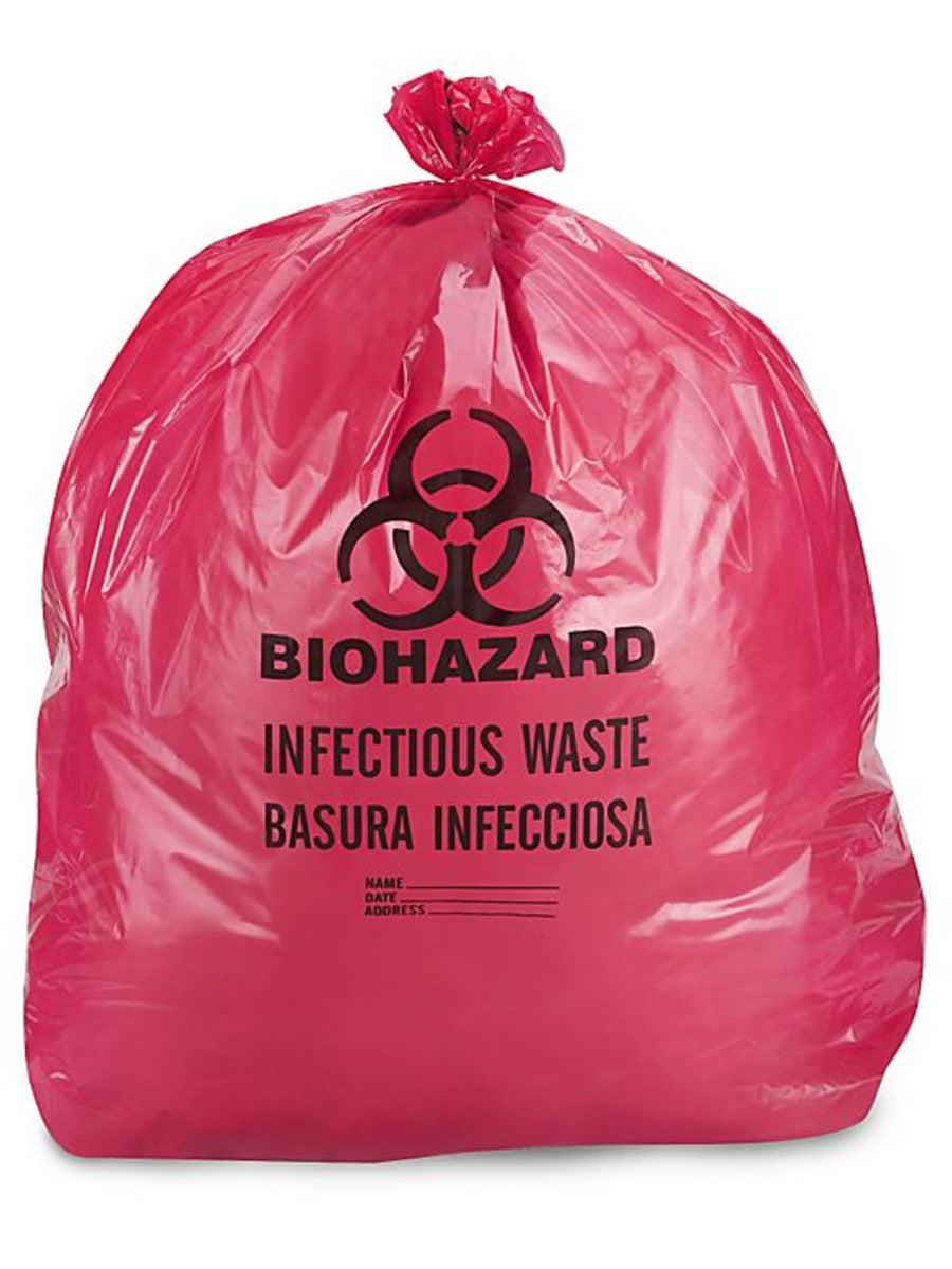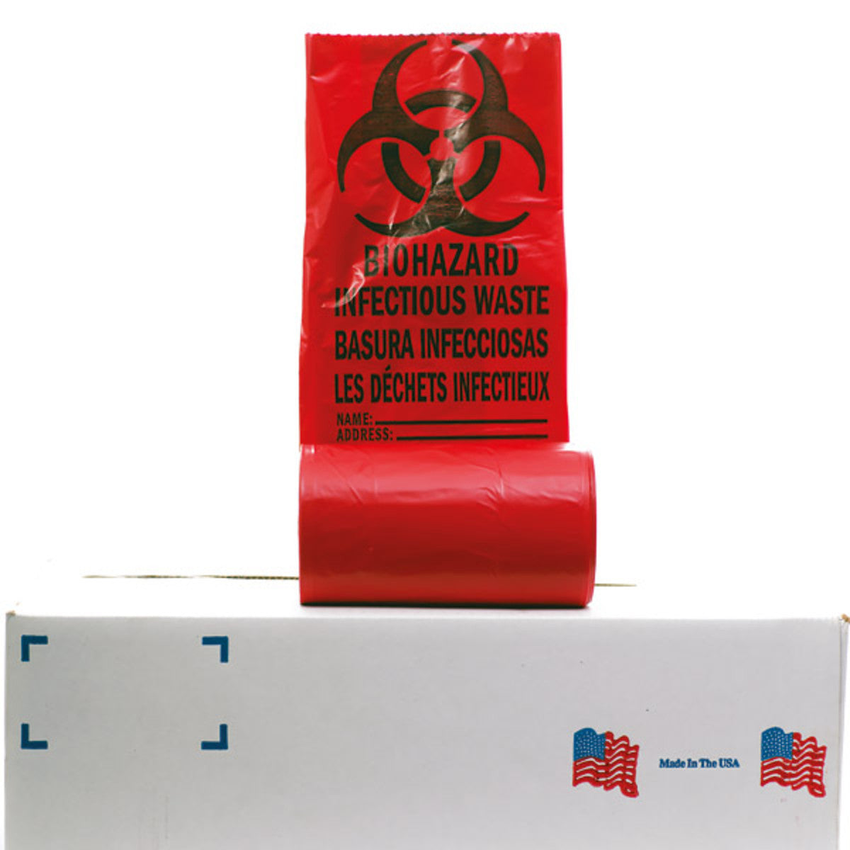 Our Red Infectious bags are printed with a warning message in English and Spanish. Printing is in black ink, one side, random repeat. All bags are supplied with star seal bottoms and are packed in rugged, white corrugated cartons.